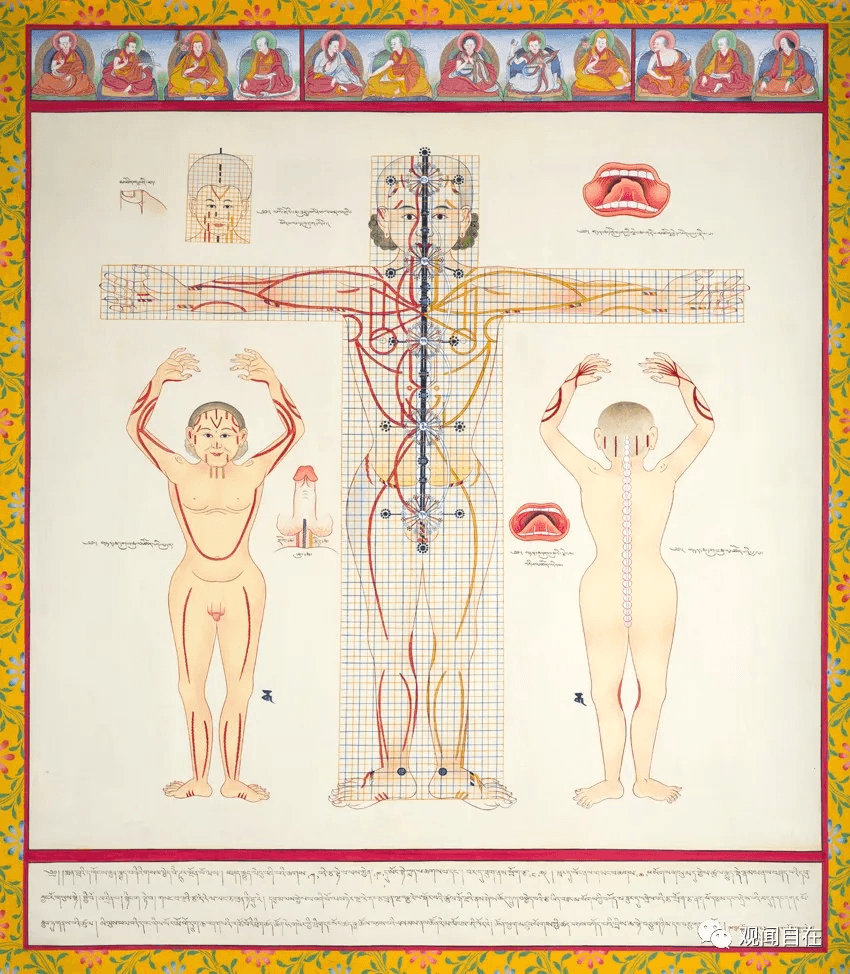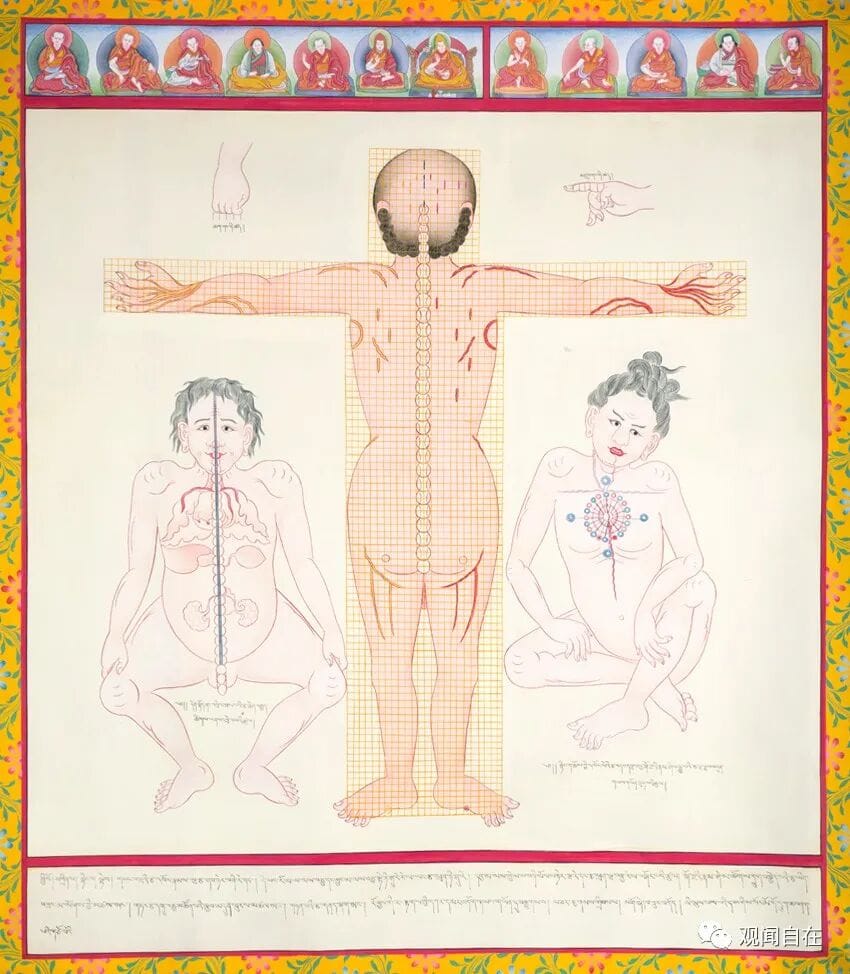(2) 主图显示,人体的脉络以脐为中心。脉络自脐向上形成脑髓,“痴”呆依附脑髓而存在,产生“培根”,故培根存在于人体上部。脉络自脐贯串中央形成命脉,“嫉愤”依附命脉而存在,产生“赤巴”,故赤巴存在于人体中部。脉络自脐向下形成生殖器官脉,“贪”欲依附生殖器官而存在,产生“隆”,故隆存在于人体下部。