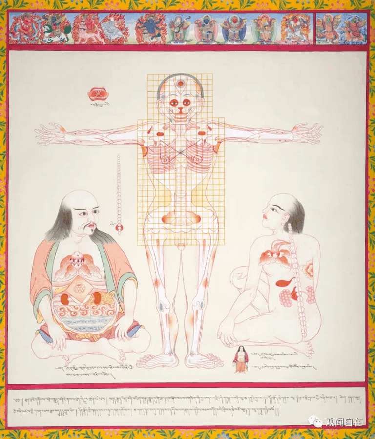 第十六图 人体的要害部位 (1) 本图系根据《四部医典蓝琉璃》中的《论述本集蓝琉璃》第四章有关内容绘制。 (2) 《论述本集蓝琉璃》第四章论述人体要害的道理时介绍 : 人体的要害有肉、脂、骨,白脉,黑脉,脏腑六类。肉受损伤则肿胀 ; 骨受损伤则剧痛 ; 白脉受损伤则感觉消失,运动失灵 ; 脂,黑脉,