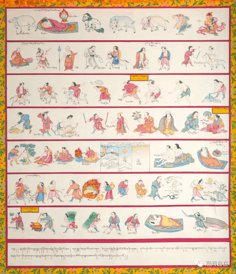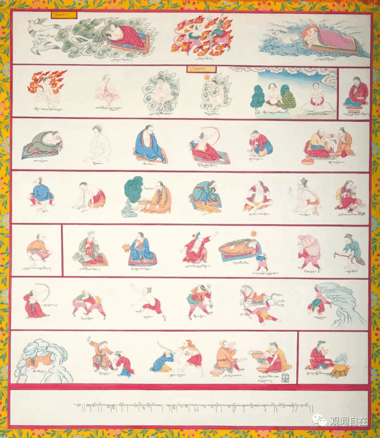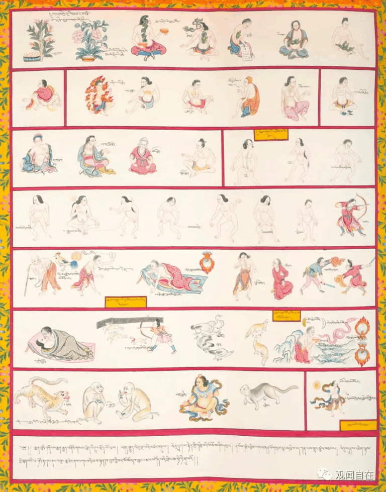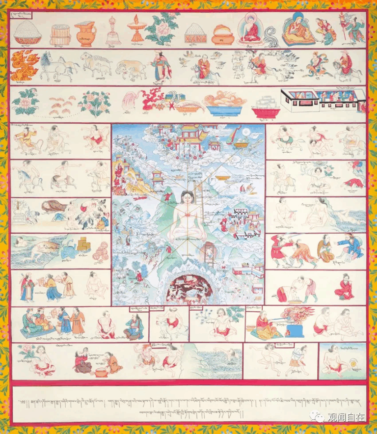 第二十图 人的死亡征兆 ( 二 ) (1) 本图系根据《四部医真·论述本集》第七章”人的死亡征兆”后半章内容编绘。 (2) 全图共有以下五段内容 :1 健康,长寿,安乐的吉祥梦兆。 2 死亡征光。 3 濒死征光。内中插入两小段引自《八支药方》的濒死征兆。 4 临死表现。图示人的死亡主要是由于地,水,