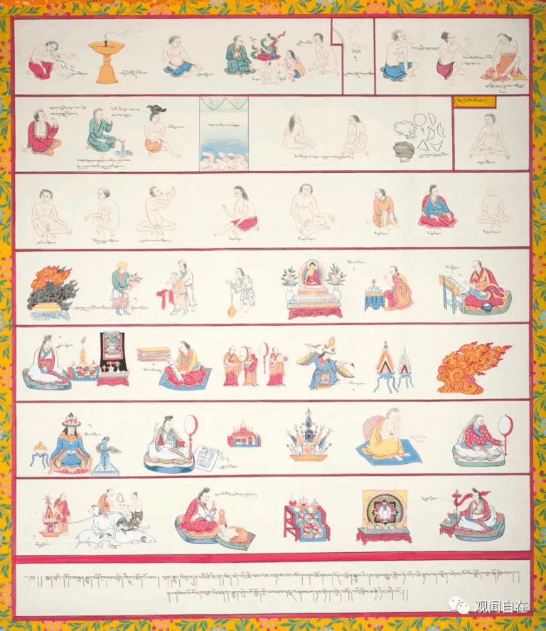 第二十图 人的死亡征兆 ( 二 ) (1) 本图系根据《四部医真·论述本集》第七章”人的死亡征兆”后半章内容编绘。 (2) 全图共有以下五段内容 :1 健康,长寿,安乐的吉祥梦兆。 2 死亡征光。 3 濒死征光。内中插入两小段引自《八支药方》的濒死征兆。 4 临死表现。图示人的死亡主要是由于地,水,