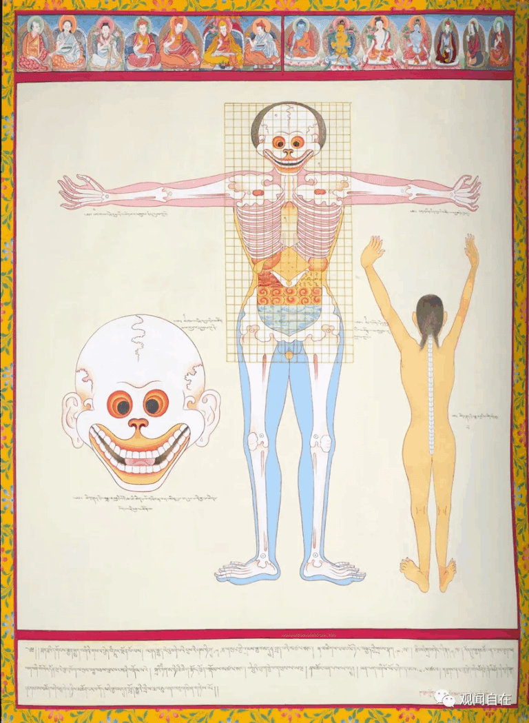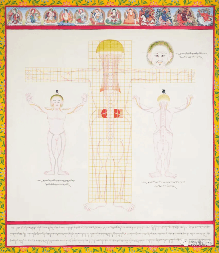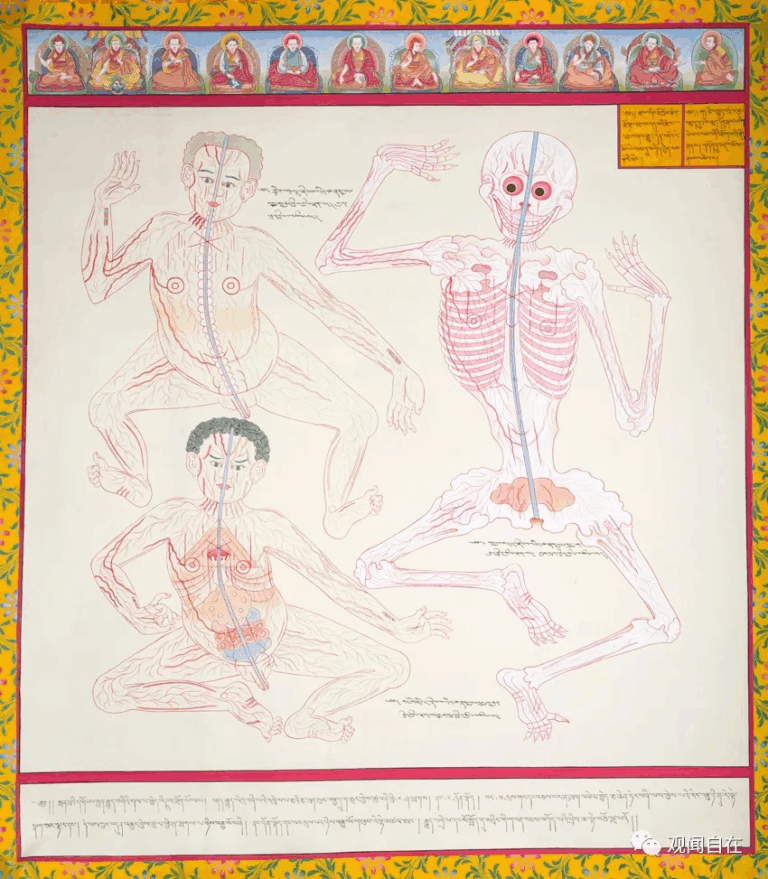 (1)本图系根据《四部医典·总则本集》第三章“人体的生理和病理”内容编绘。 (2)根据戴医经典叙述,图的上角绘有:土珠热白益西(1)传讲《四部医典·总則本集》和松竹益来盖敬听的内容。 (3)本图用树的根、干、枝、叶,形象地系统介绍人体的生理功能和病理变化。 (4)据第司·桑结嘉措著《戴医史》记述: