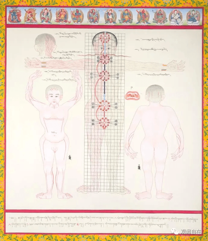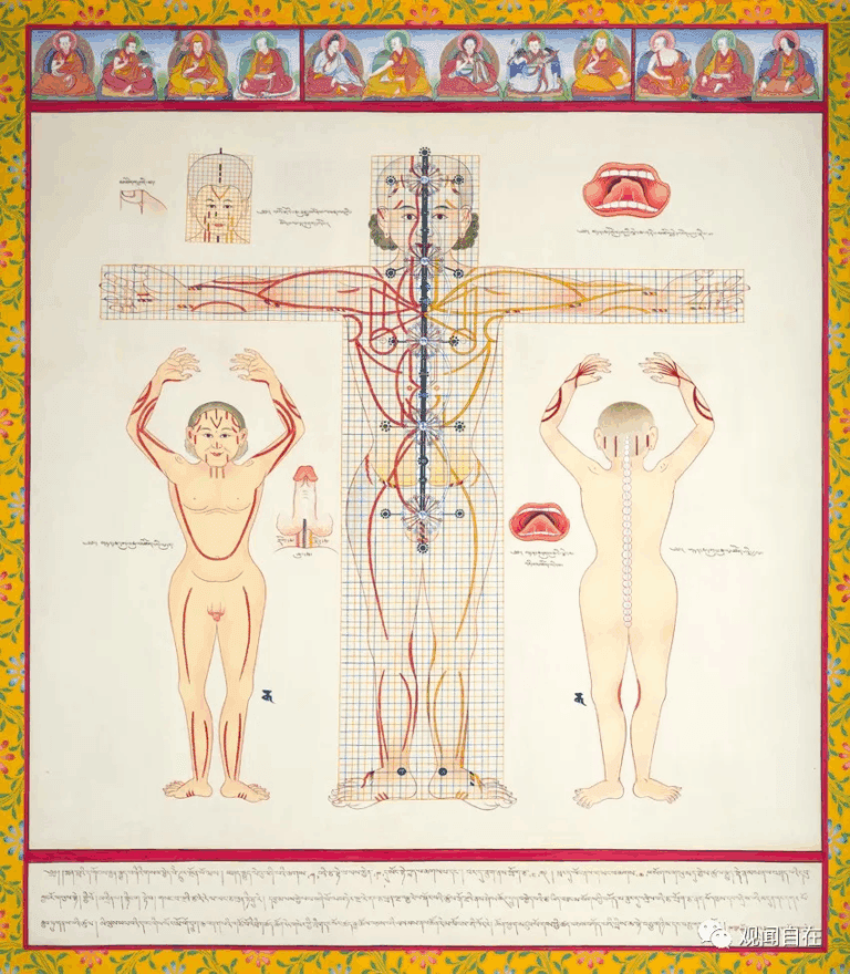 第十三图 人体的连接脉 (1) 本图泰根据《四都医典蓝琉璃》中的《论述本集蓝境璃》第四章有关内容绘制。 (2) 据第司·桑结嘉措著《藏医史》记述,本图的主要内容是“三百六十支连接脉”。 (3) 连接脉中的一百二十支,向外分布,连接皮和肉,由此再分为百三十四个分支 ; 连接脉中的一百二十支,向中分布,