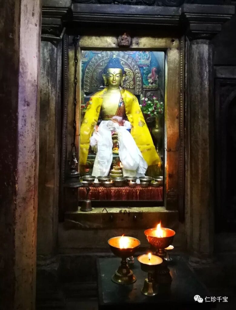 第二金刚亥母 圣地在千佛塔对面的二楼,这里是恩扎普提金刚瑜伽母圣地 ,供奉的是飞舞姿态的金刚瑜伽母,名号为善业空行女。众弟子在宝上师带领下于此点灯,持诵咒语。