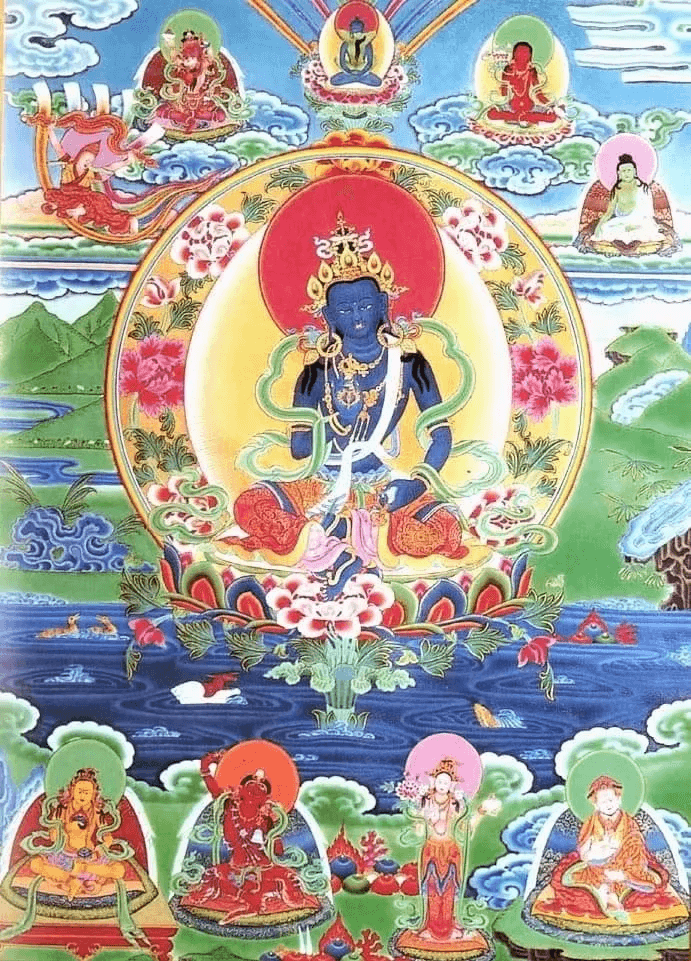 本尊身蓝色,右手触地印,左手持金刚杵。