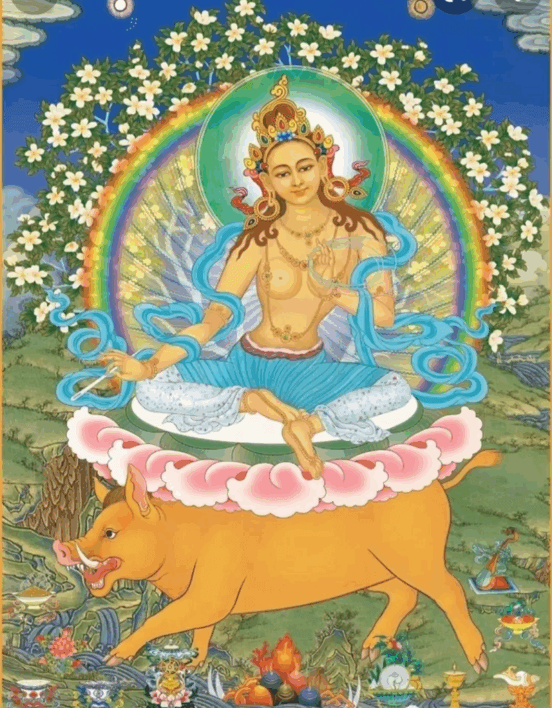 佛母坐在铁猪上,摩利支天一般坐在七只猪所拉的车上,但这里是一只猪上,有莲花日月座,骑坐在铁猪上,黑色、具獠牙、凶猛的铁猪。